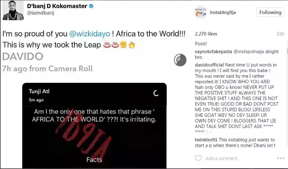 InstaBlog9ja, some how brought Davido into the whole squabble saying; “It is a fact that D’banj’s popular catchphrase, Africa to the world, is irritating – Davido”.